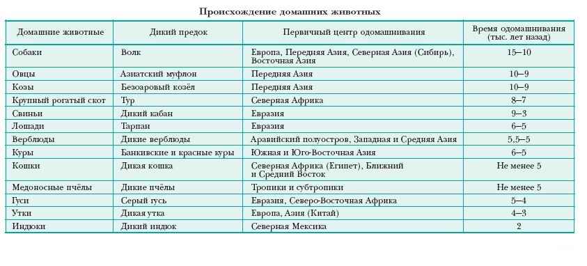 Процесс приручения животных длился несколько тысячелетий (см. Доместификация), в различные периоды были одомашнены разные животные (см. табл.).
