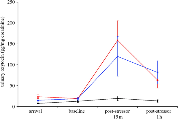 Уровень окситоцина у девочек. Синяя линия — телефонное общение, красная — непосредственный контакт. Черная линия — контрольная группа. График из обсуждаемой статьи в Proceedings of Royal Society B