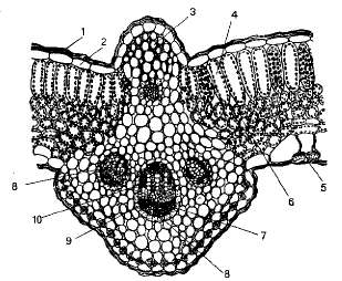 Рис. 8.13. Анатомическое строение листа георгины (поперечный срез): 1 — кутикула; 2 — эпидермис; 3 -— колленхима; 4 — палисадная паренхима; 5—устьице; 6 — губчатая паренхима; 7 — флоэма; 8 — прово дящий пучок; 9 — склеренхима; 10 — ксилема.