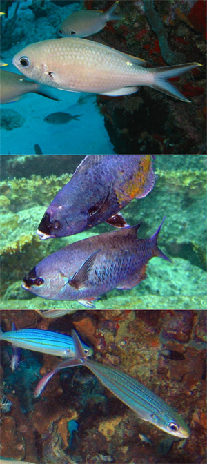 Многие виды рыб собираются возле рифов в скопления, включающие десятки или сотни особей, и питаются планктоном, или бентосом (донными организмами) — в том числе самими кораллами.