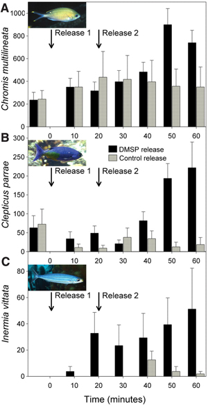 Опыты показали, что несколько видов рыб собираются у источников раствора диметилсульфониопропионата достоверно чаще, чем у источников дистиллированной воды. Некоторые из отмеченных возле источников ДМСП видов рыб собирались там в массе, группами в несколько сотен особей.